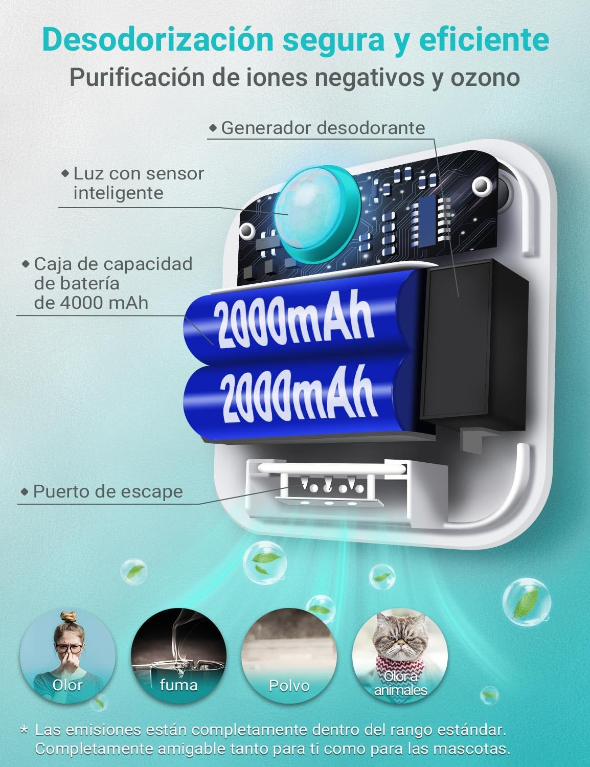Sí, completamente seguro. El dispositivo cuenta con sensor inteligente que se apaga al detectar presencia cercana. No utiliza productos químicos ni fragancias: funciona solo con iones negativos, 100 % seguros para mascotas.